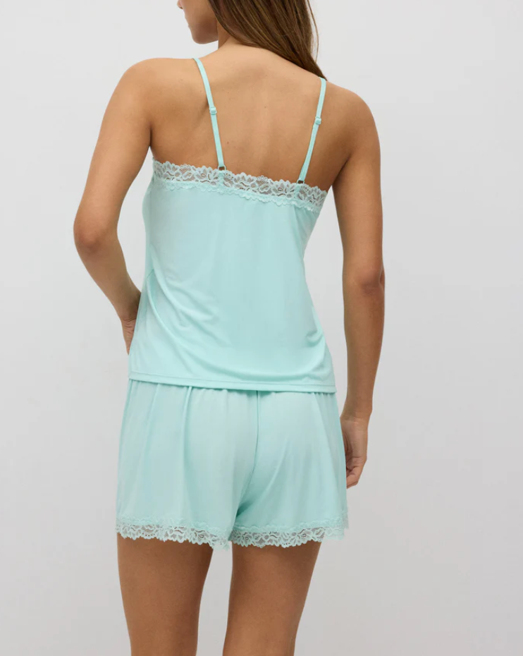 O top apresenta um corte fluido e confortável, com decote redondo e alças largas estilo nadador, valorizadas por um delicado detalhe em renda na zona dos ombros, que acrescenta um toque feminino e elegante.