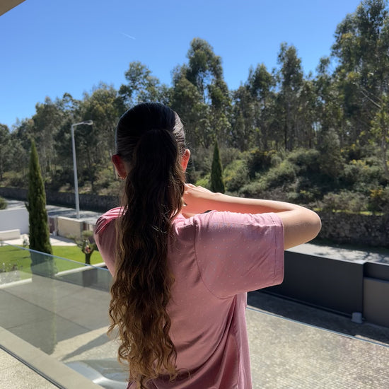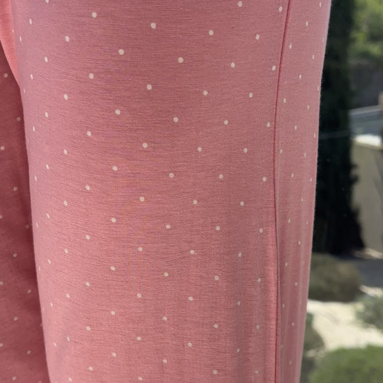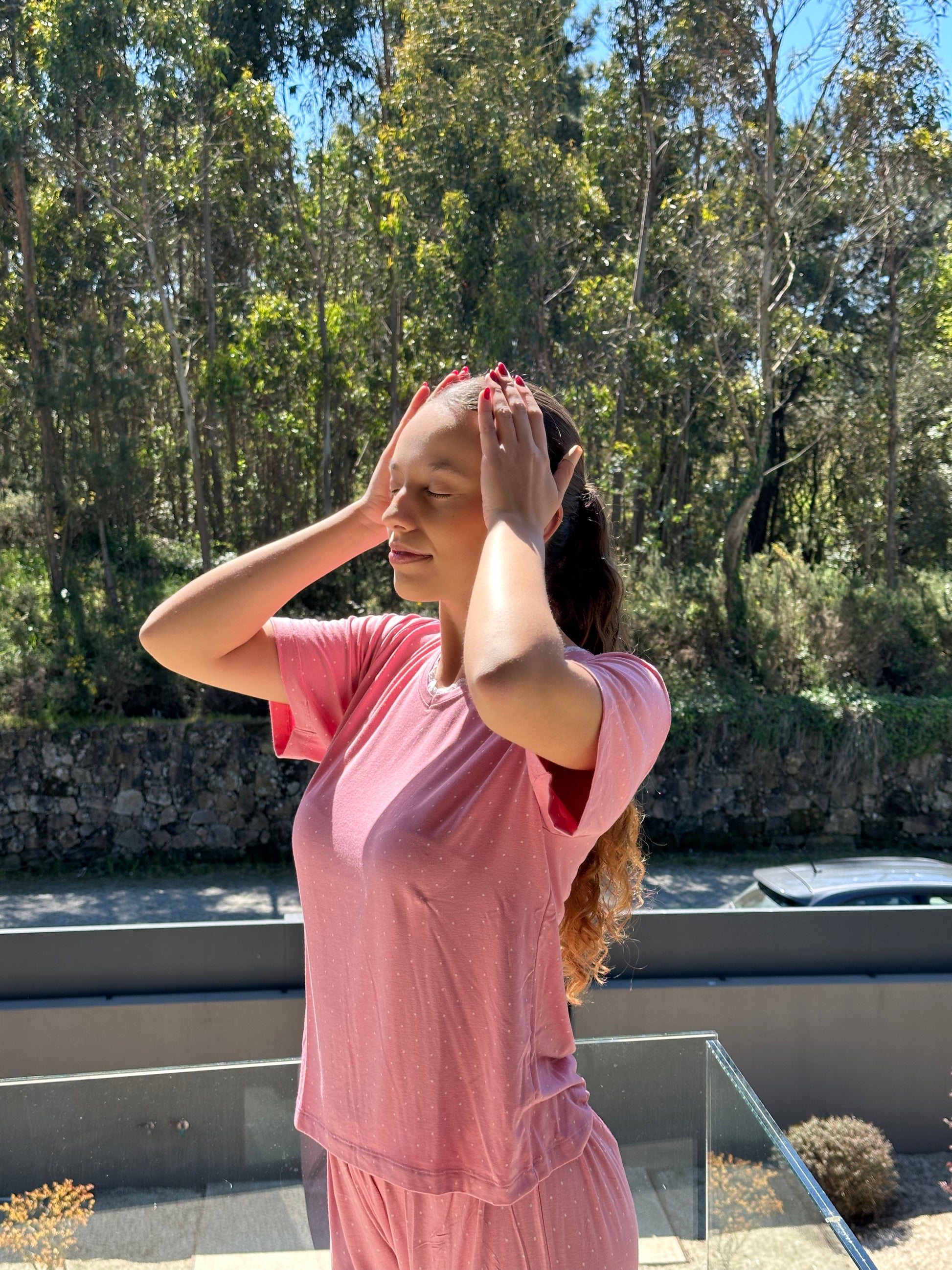 Modelo pijama composto por camisola de manga curta e calça comprida com cós elástico e cordão ajustável. Camisola de corte solto, leve e confortável. Calça com ajuste suave, proporcionando liberdade de movimentos e um toque macio na pele.