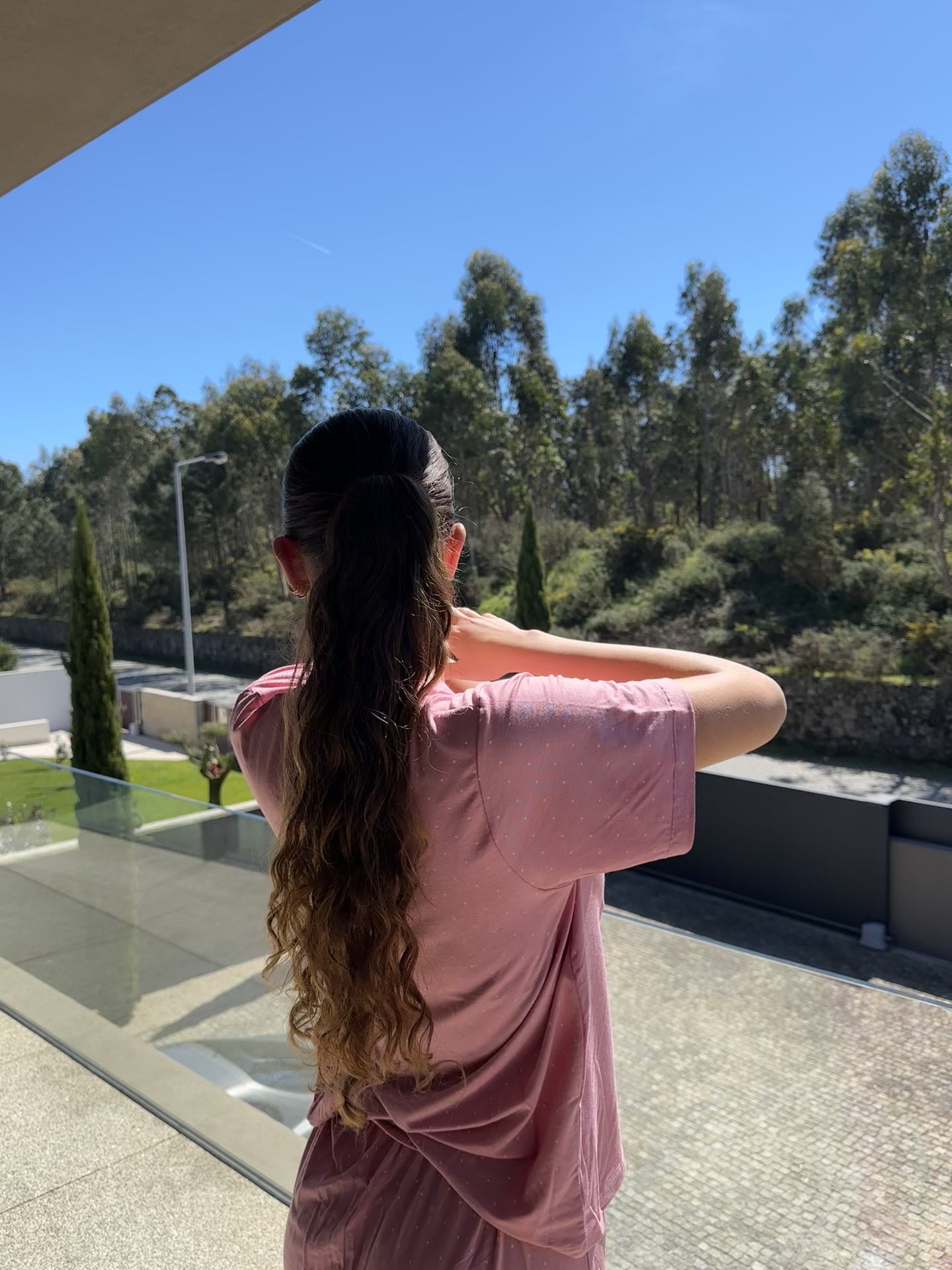 A modelo veste o tamanho M para um efeito fluído e confortável.