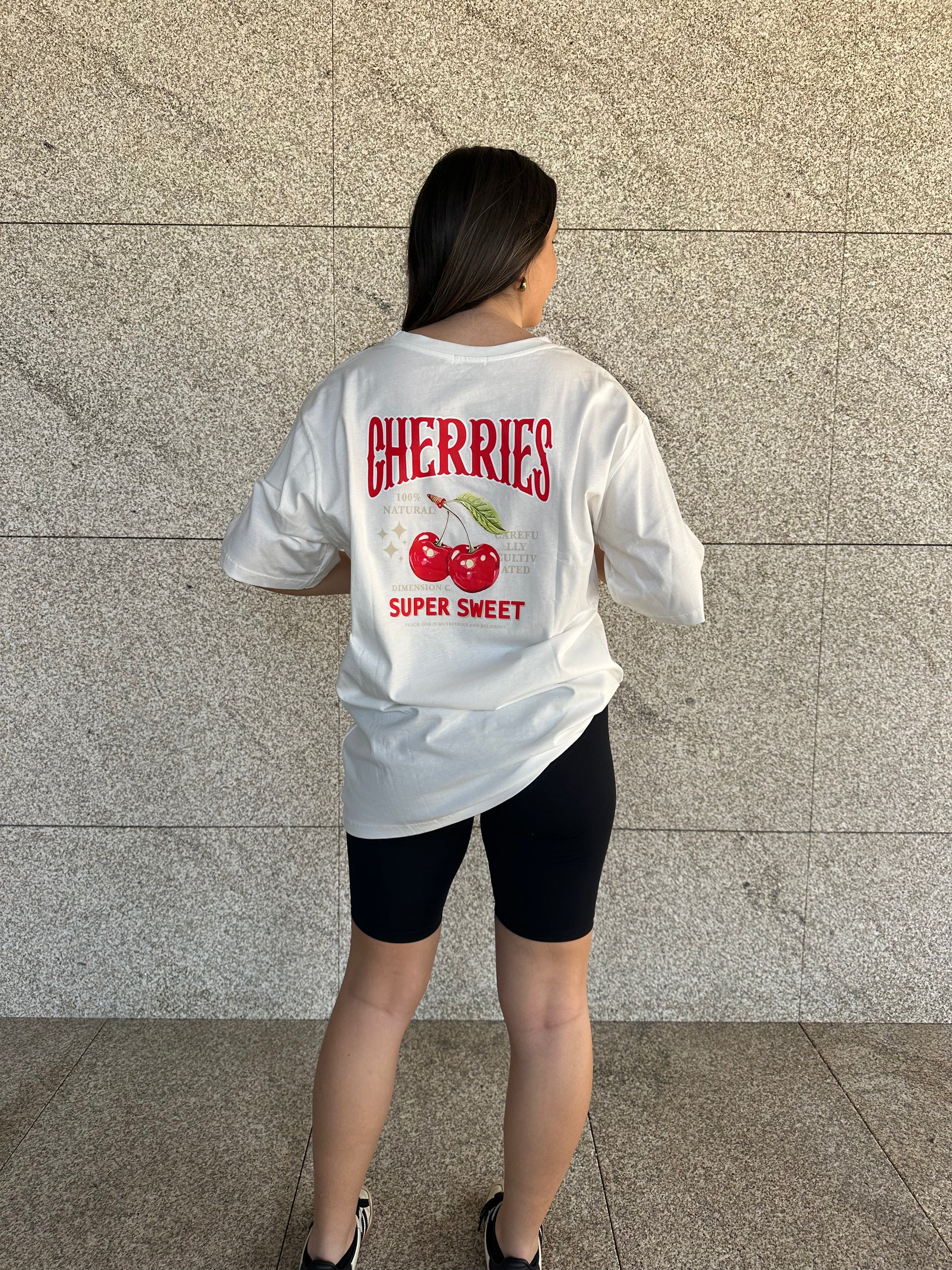 O destaque vai para a estampa traseira, com o design de cerejas mais cute & cool de sempre — impossível passar despercebida! Na parte frontal, uma pequena legenda adiciona um toque discreto e estiloso.