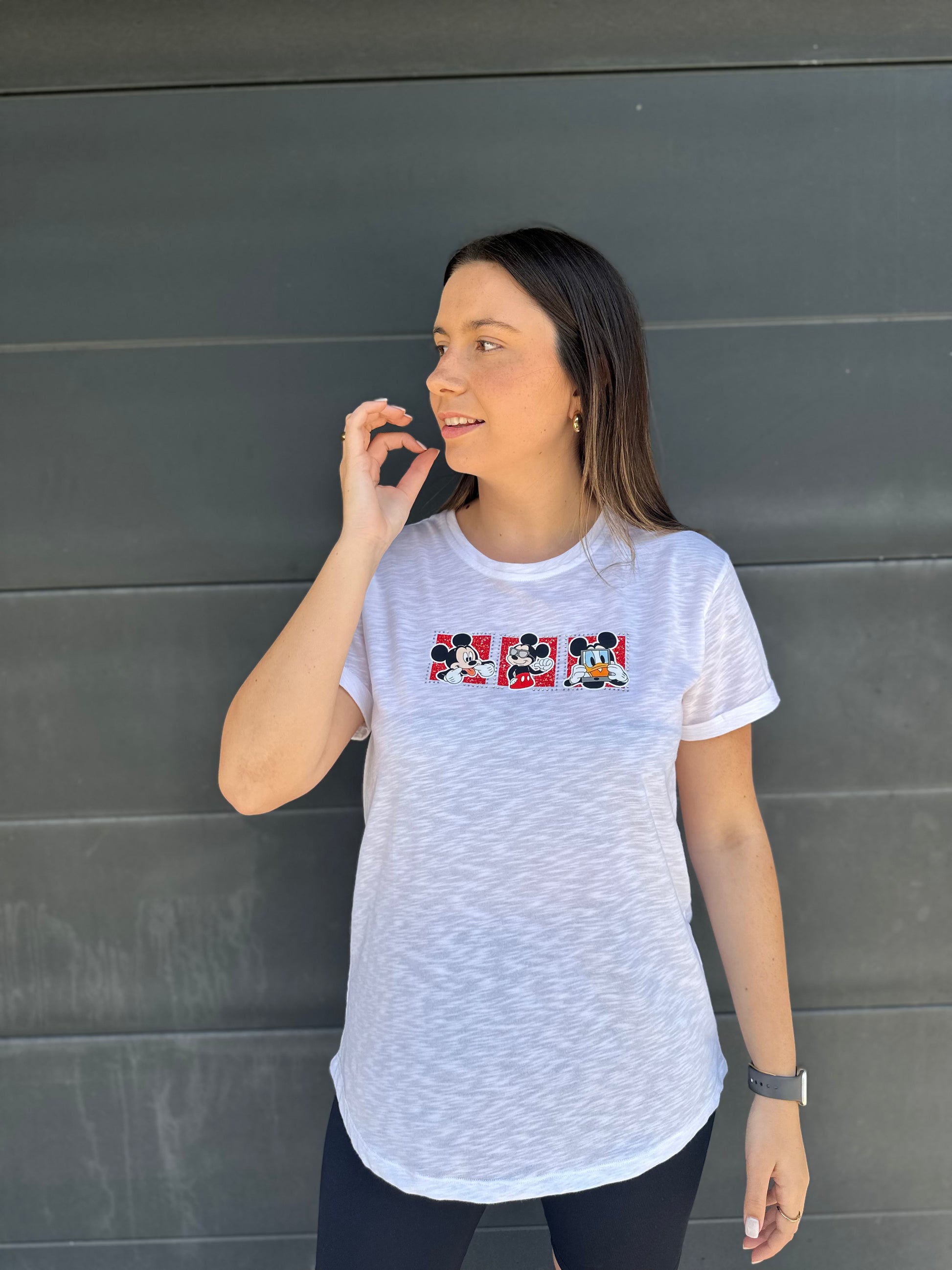 O destaque vai para o estampado frontal: três divertidos bonecos do Mickey que acrescentam um toque de nostalgia e irreverência ao teu look. Ideal para um visual casual com personalidade, combina na perfeição com calções, jeans ou leggings.