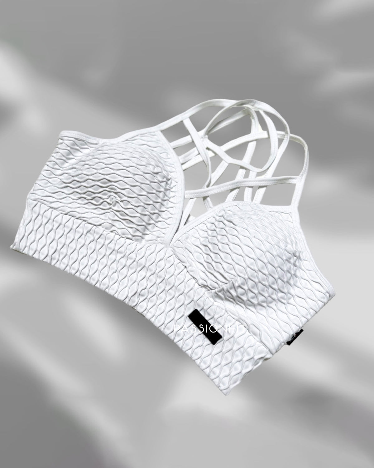 Modelo de decote em "V", com alças finas que se cruzam, apesar de serem finas, suportam bem o peito. Com copas amovíveis. A sua textura em formato de onda é confortável.